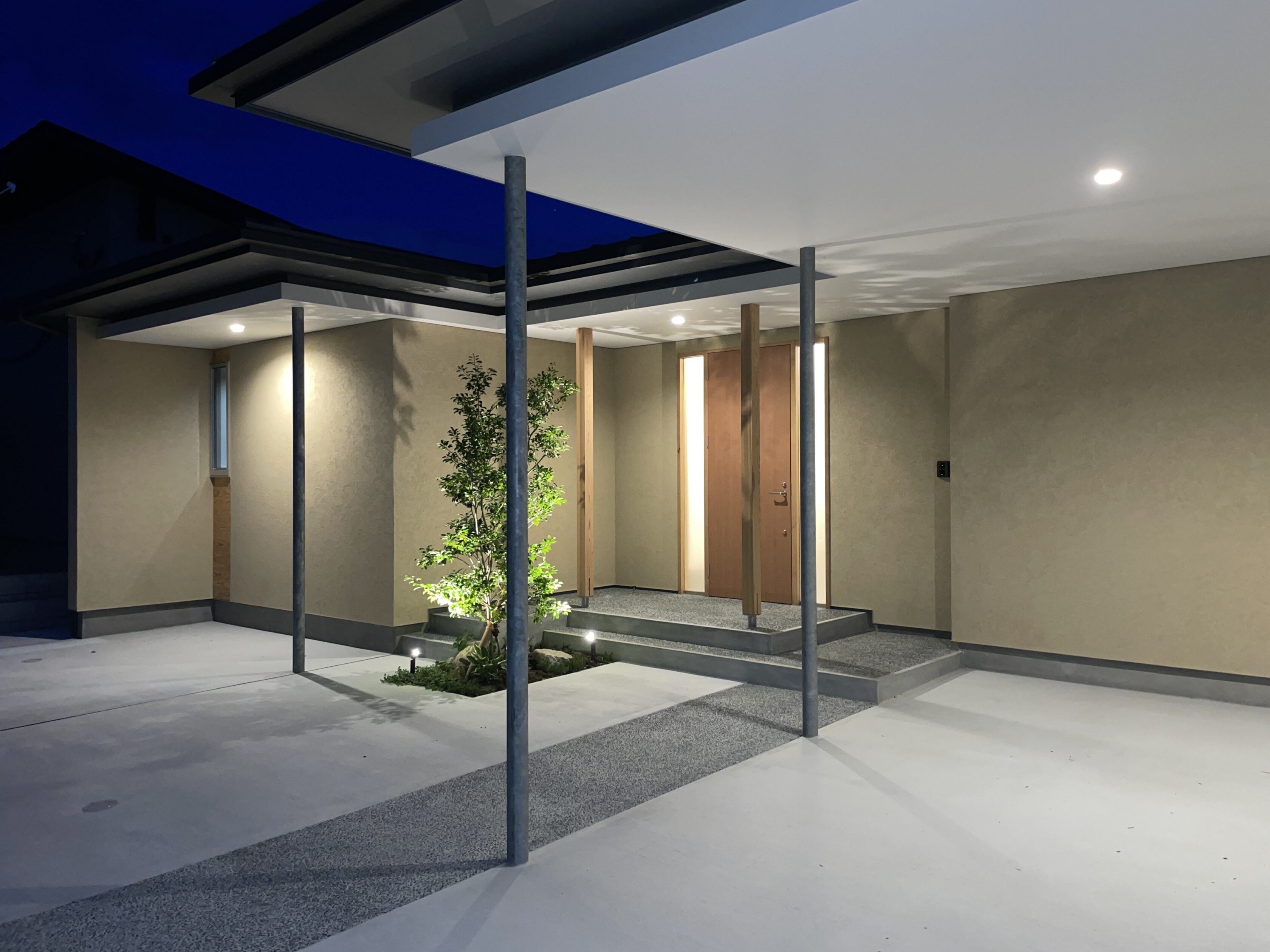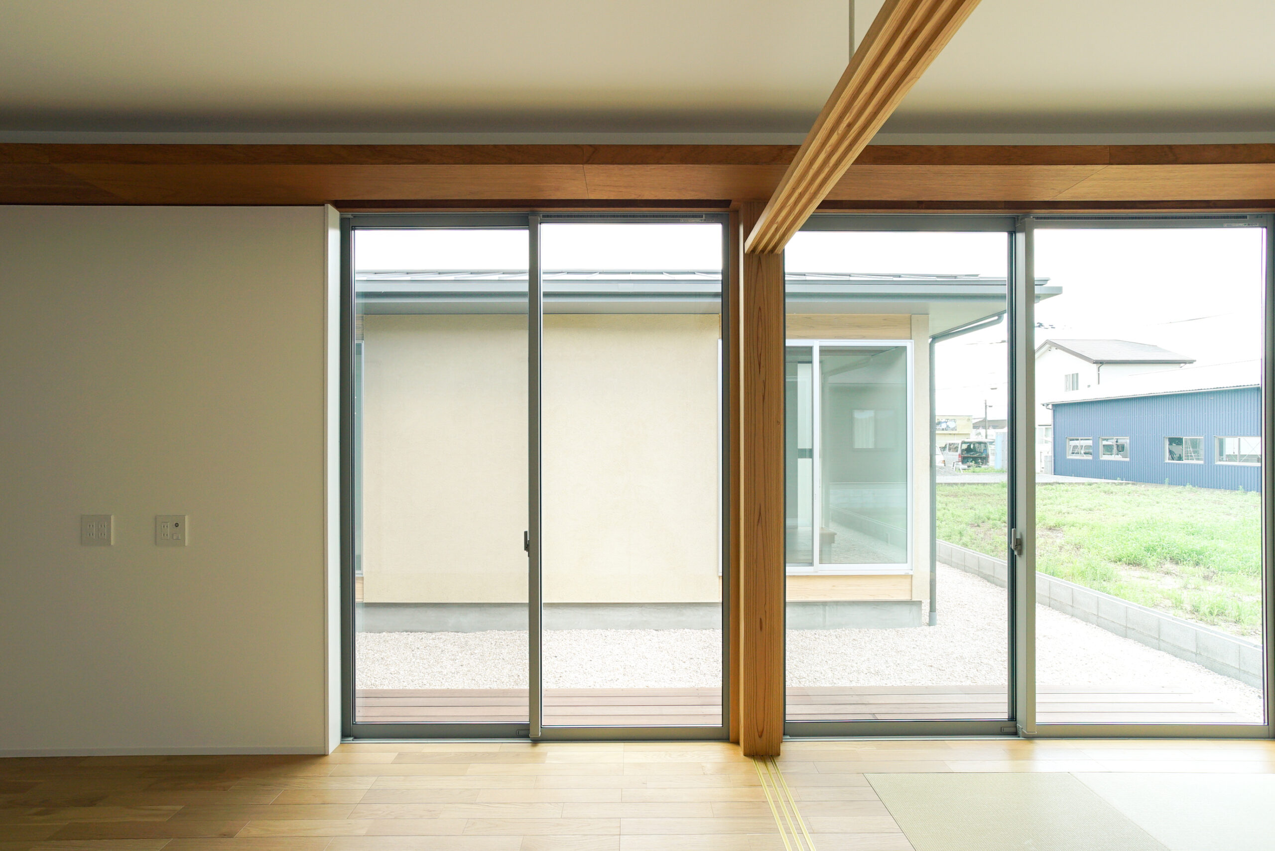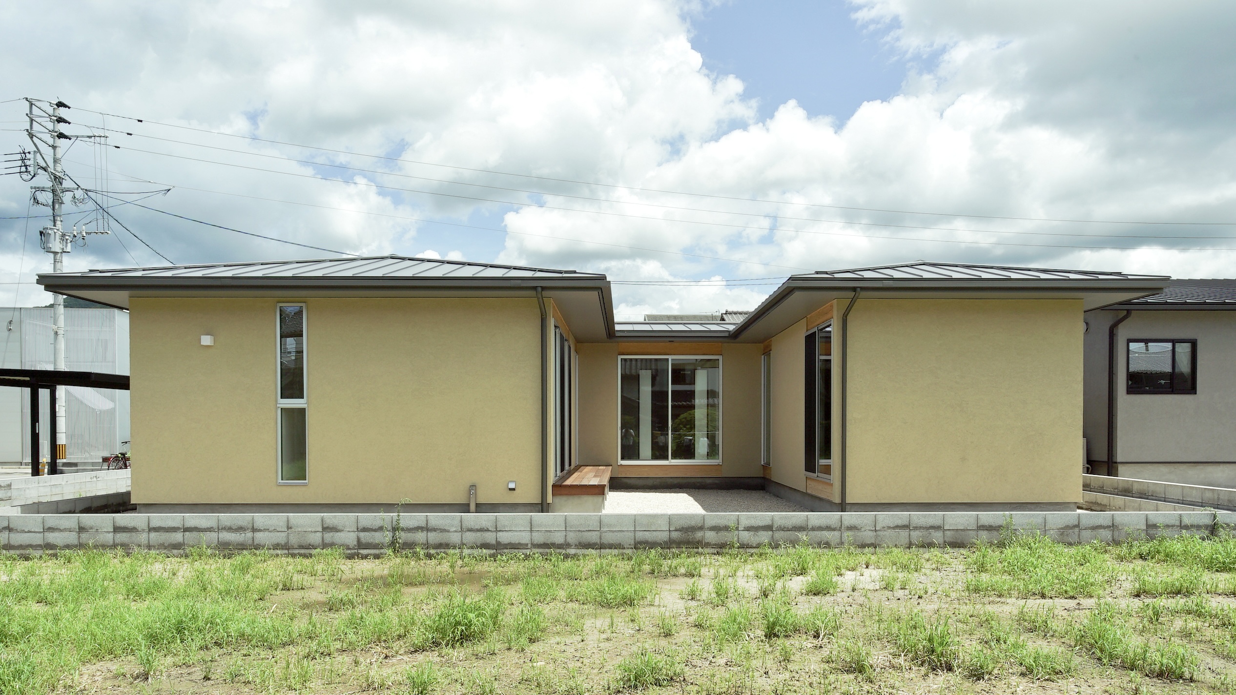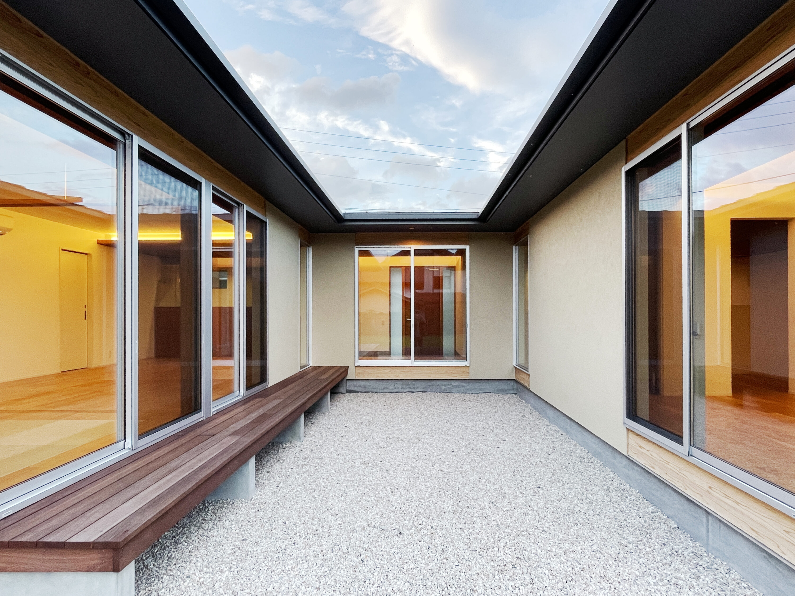 この家は上から見るとHの形をしています。 H形の間取りは中庭をつくったり、屋根付きのガレージをつくります。 中庭があることで、どこにいても明るく、住み心地の良い家となりました。
