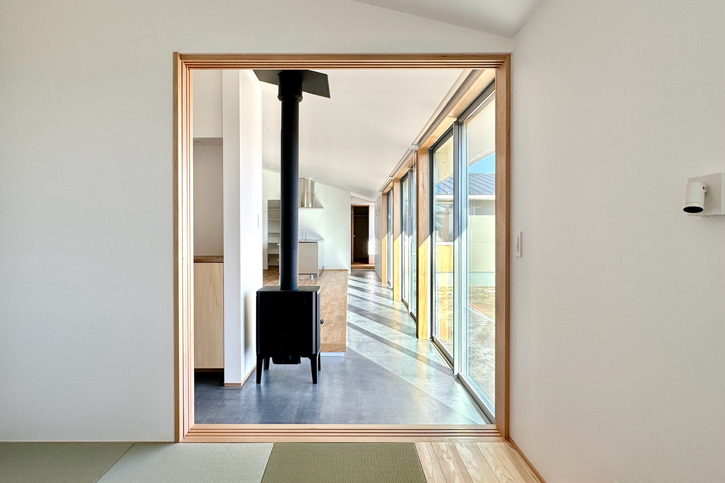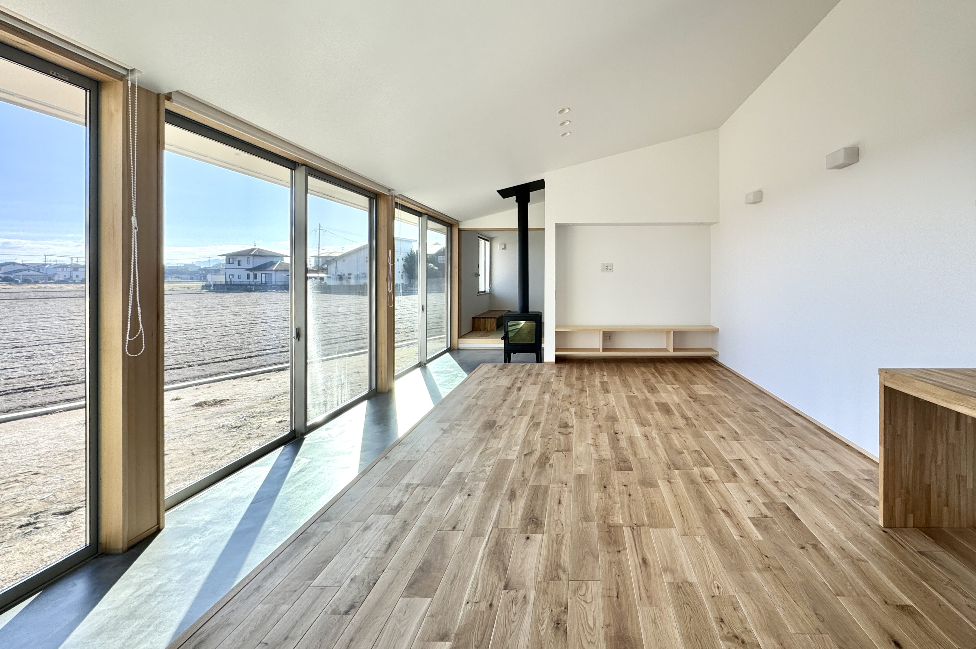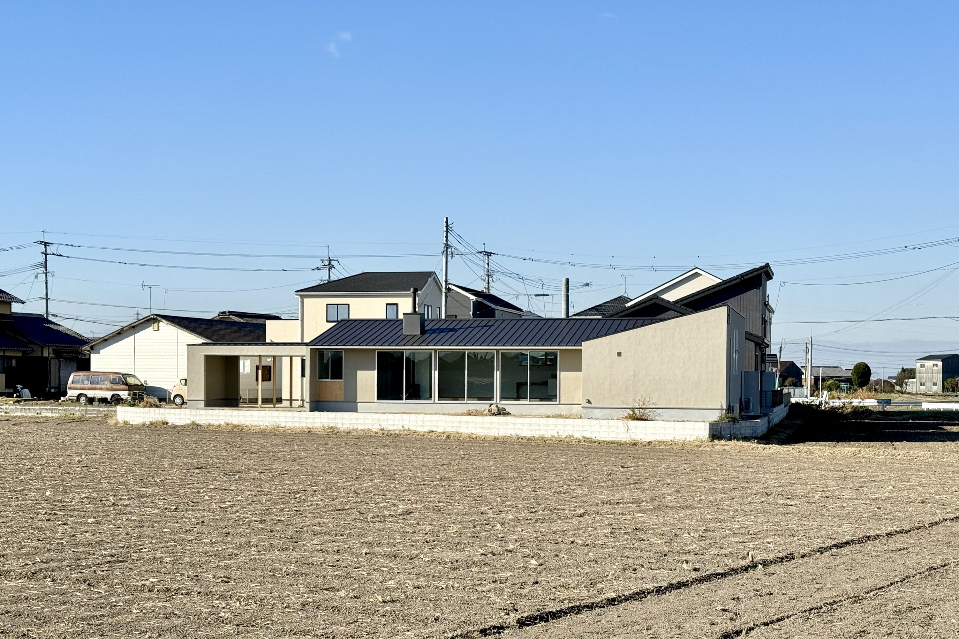 田畑が広がるのどかな土地に、光あふれる土間のある家をつくりました。 土間と庭を行き来しながら、ご家族の暮らしは外へと広がります。 わずかな段差のある土間は、ちょこんと座って景色を眺める縁側のような場所です。
